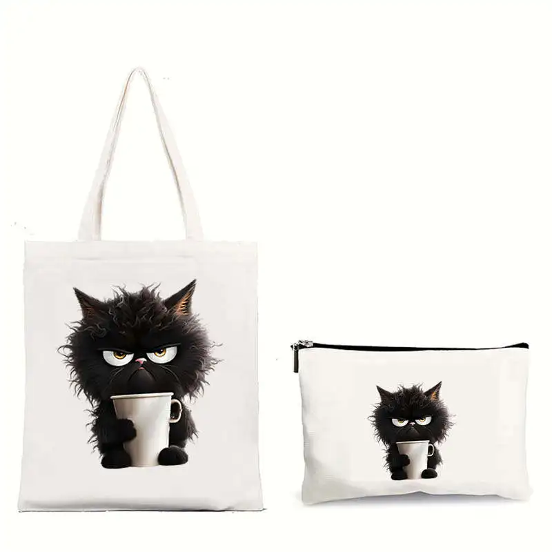 2PC Cute Kitten Cat Pattern Printed Women Shoulder Bag Kawaii Shopper Shopping Canvas Bag Fashion Girl Handbags Shoulder Bag