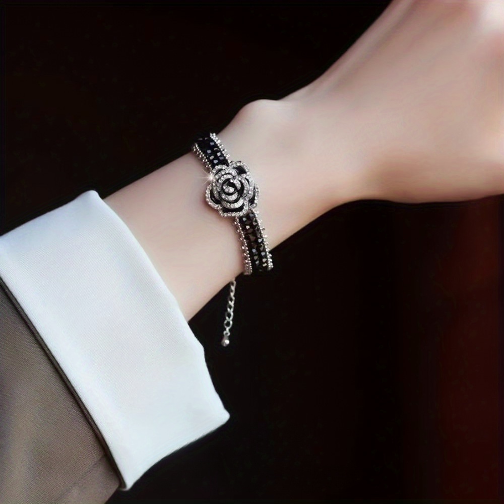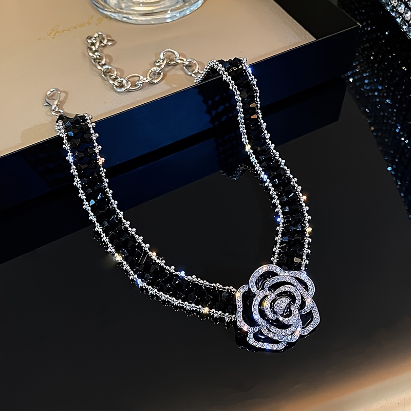 4pcs Elegant Black Rose Jewelry Set for Women, Featuring Shimmering Rhinestones And Beaded Accents, Including a Choker Necklace, Bracelet, And Earrings, Perfect for Special Occasions Or Formal Events, a Thoughtful Gift for Lo
