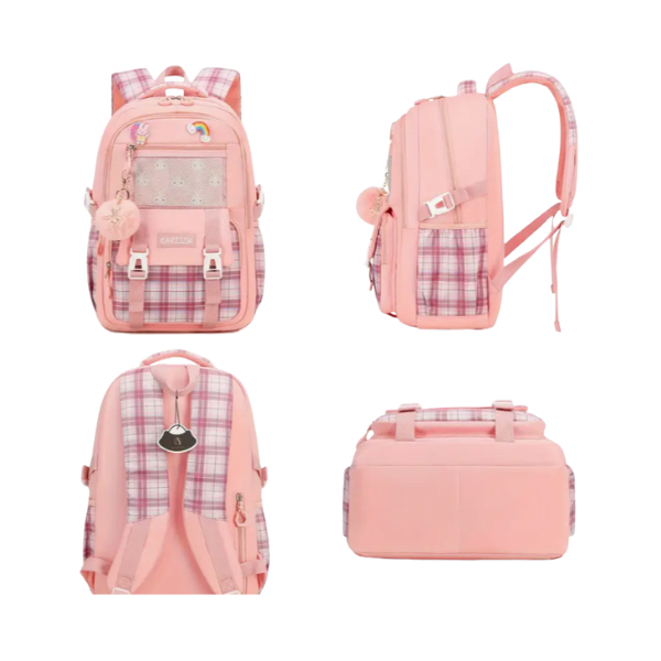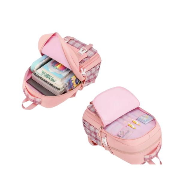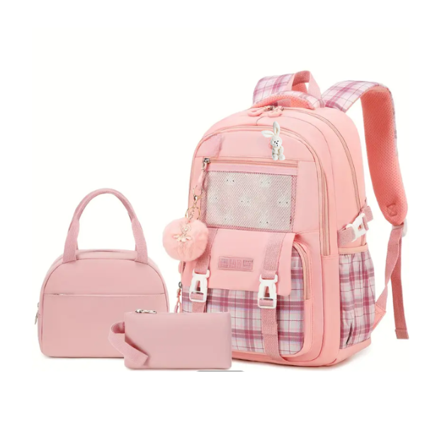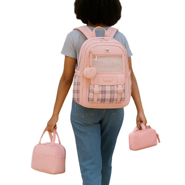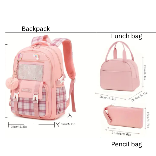 Go back to school in style with this adorable and functional 3-piece set! Perfect for school, travel, camping, or daily use, this pink plaid set includes: