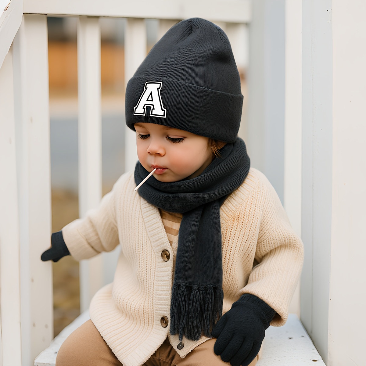 [Birthday/Christmas Gift] 3pcs Baby Alphabet Knit Hat, Scarf & Gloves Set - 26 Letters (A-Z) Warm Winter Outfit, Soft Knit Winter Wear for Boys & Girls, Birthday/Christmas Gift, Outdoor & School Cold-weather Essentials, Outdo