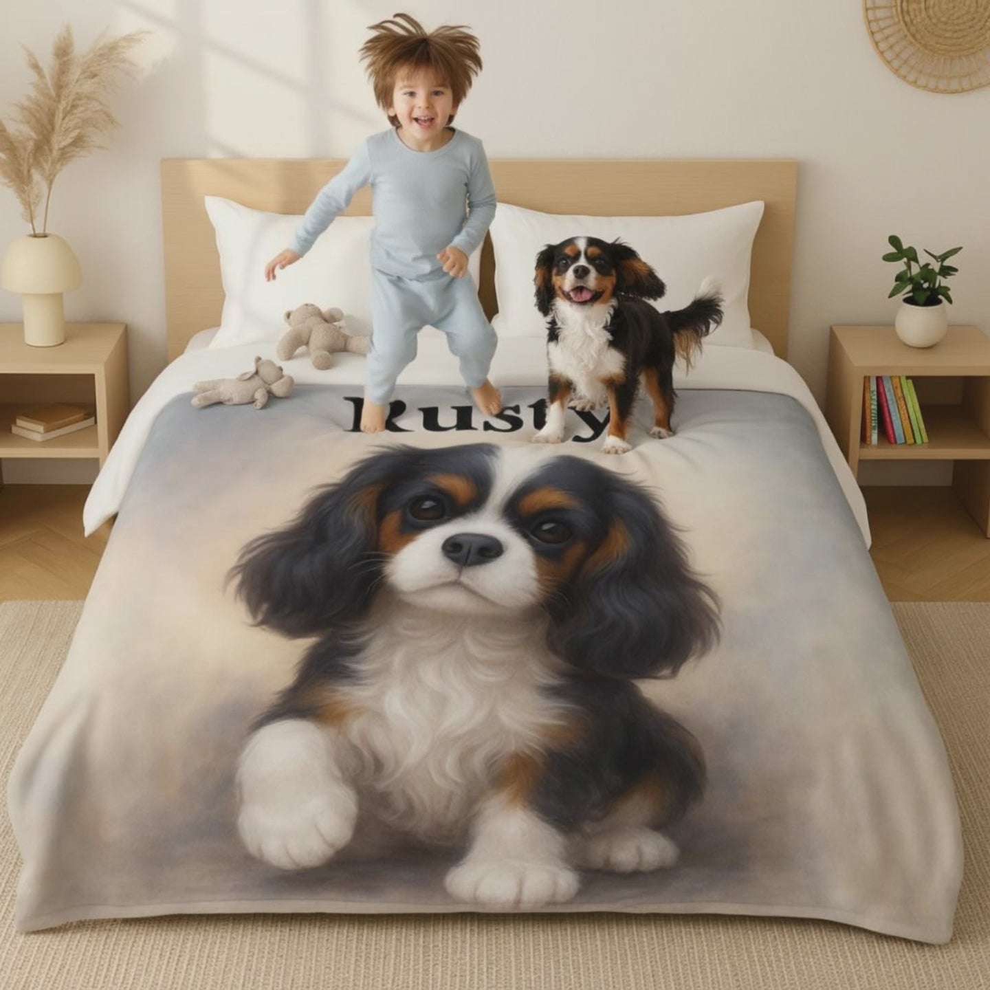 Personalization makes it magical. ✨ Add your dog’s name — “Rusty,” “Bella,” “Max,” or your furry friend’s unique nickname — and watch their charm come alive in a one-of-a-kind keepsake blanket. It’s not just home décor; it’s a story woven in love.