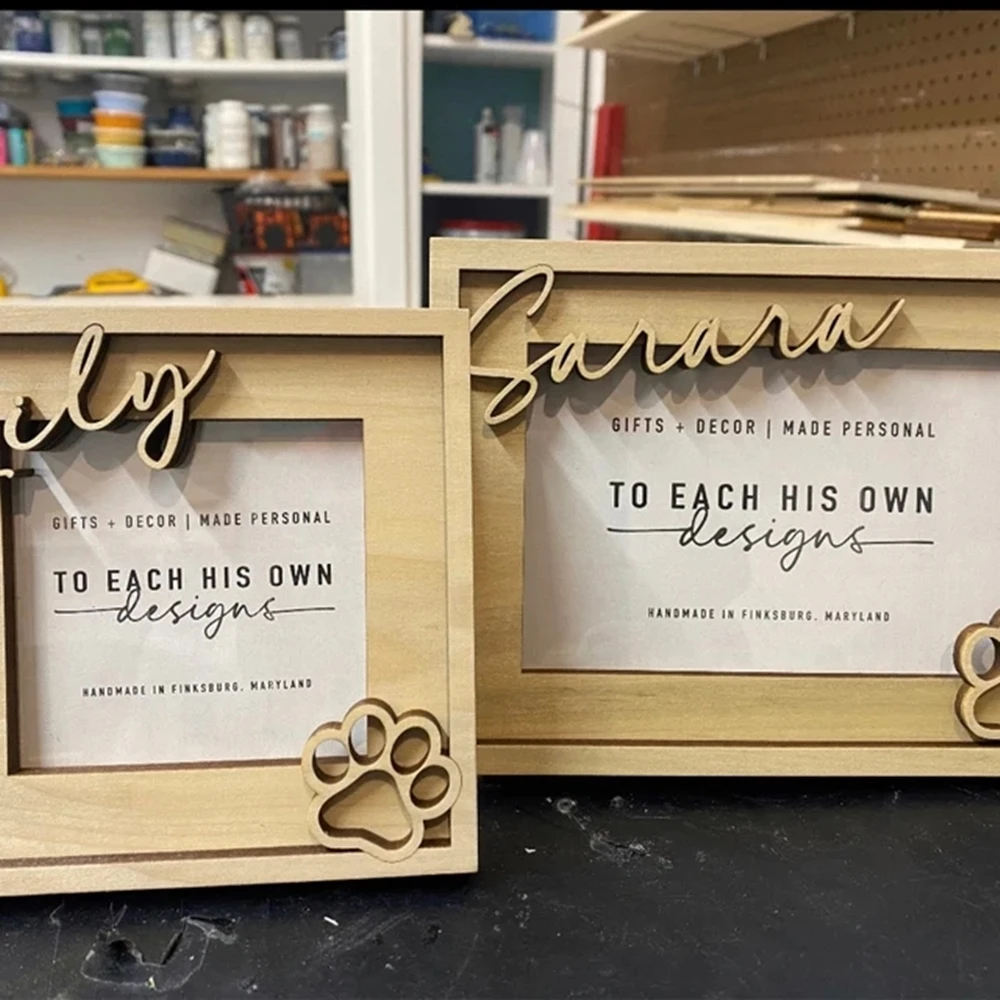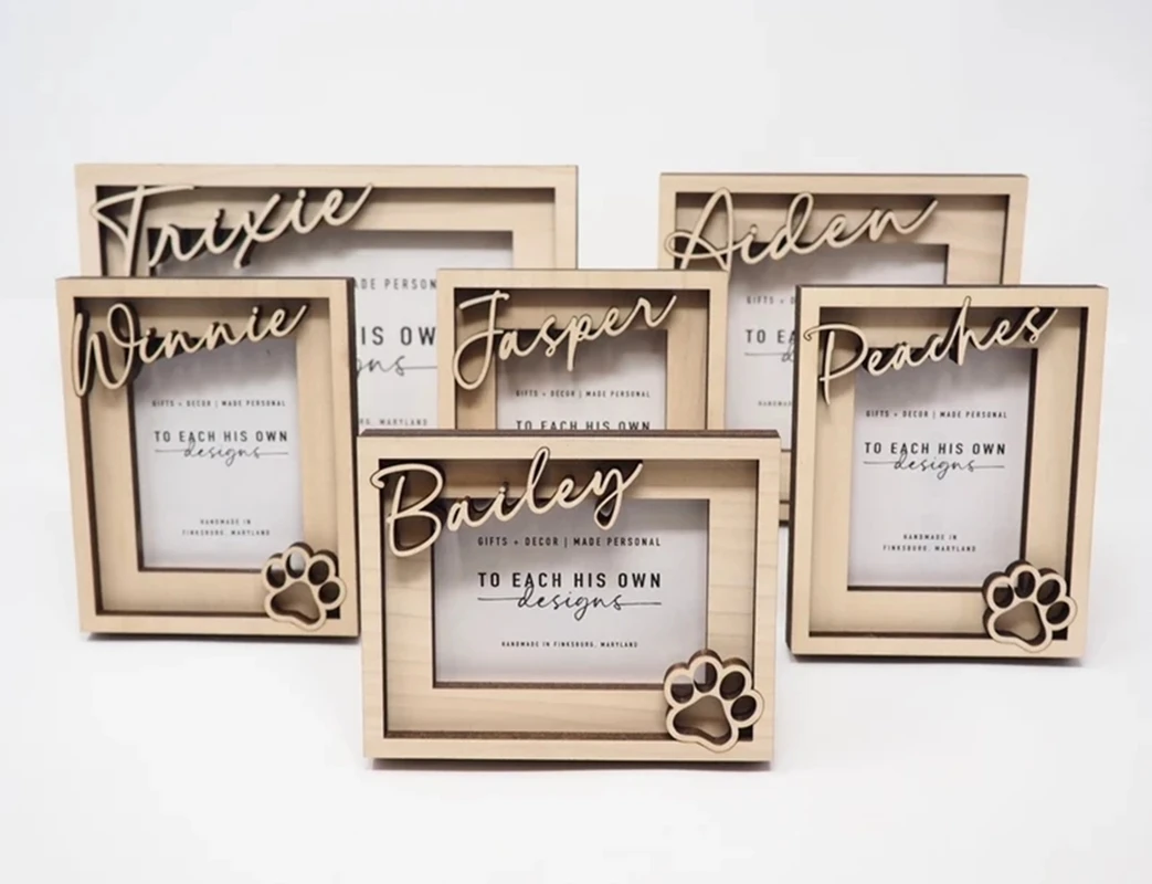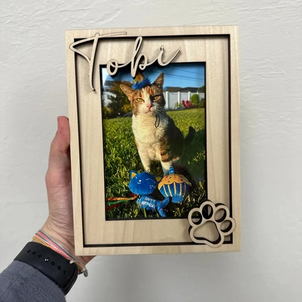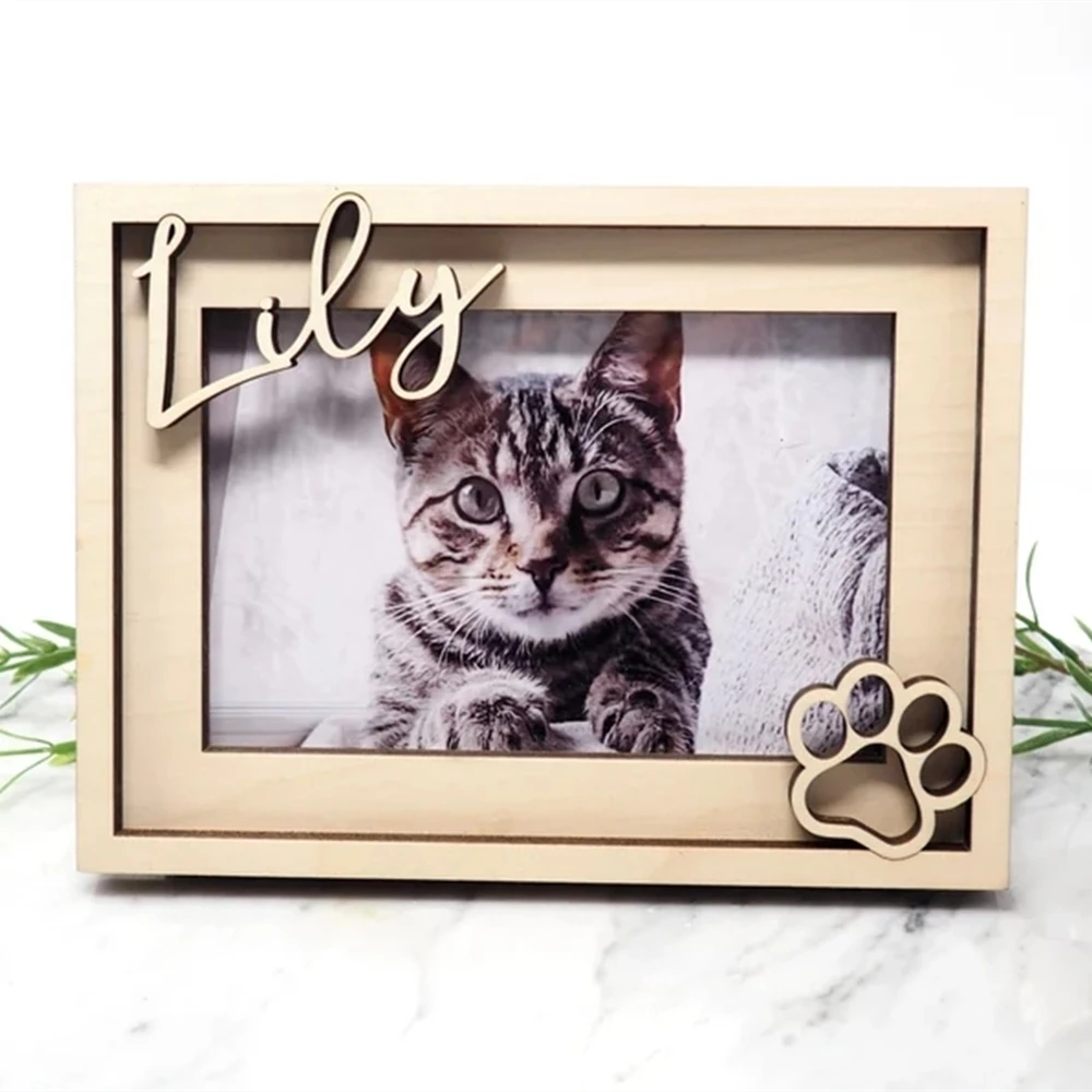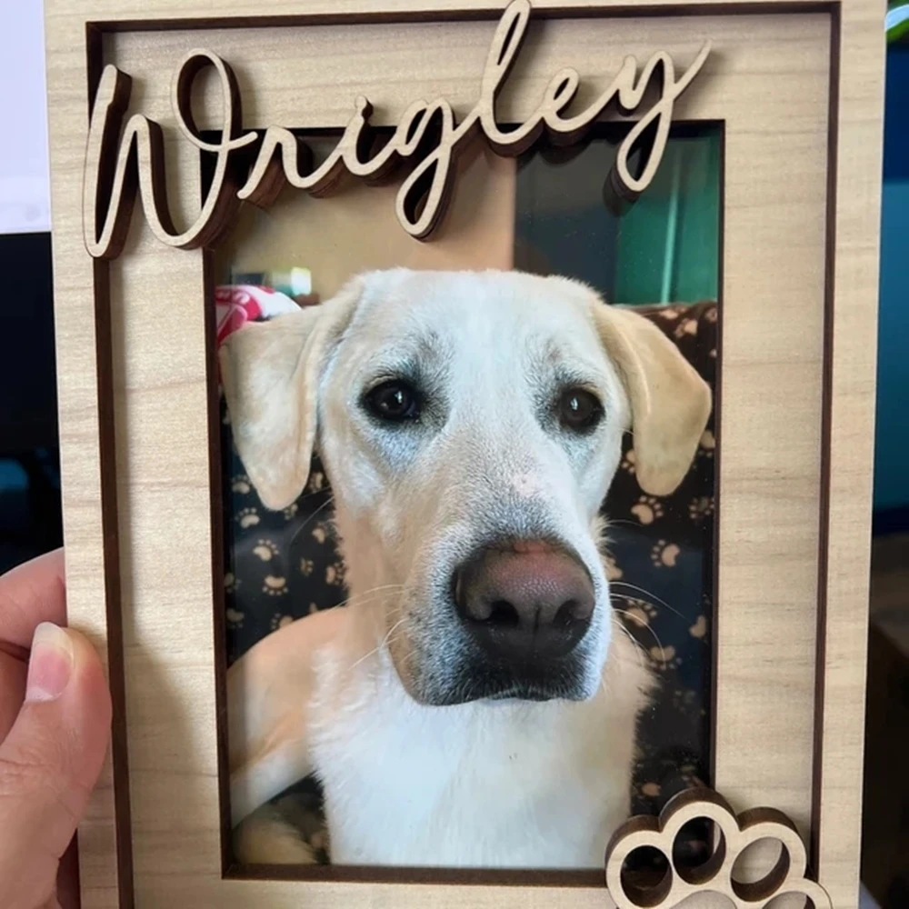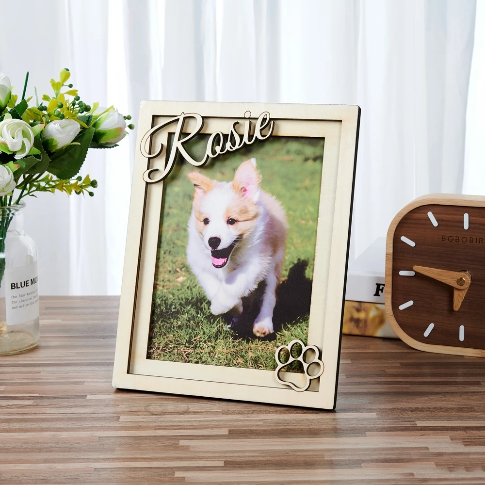 This dog picture frame makes a great dog memorial gift, or keepsake for a furry best friend. The pet's name is laser cut from solid wood for a 3D effect.