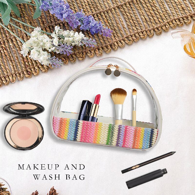 Merge bohemian flair with modern utility in this waterproof, semicircle cosmetic bag. Crafted from durable PVC and handwoven straw accents, it features vibrant rainbow stripes, offering a playful yet chic storage solution. Perfect for travel or home use, its transparent design lets you quickly locate essentials, while the waterproof material safeguards against spills. Lightweight and compact, it slips effortlessly into bags, blending practicality with eclectic style. Ideal for makeup, toiletries, or small accessories, it combines artistry and function for the free-spirited organizer.